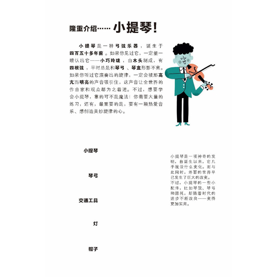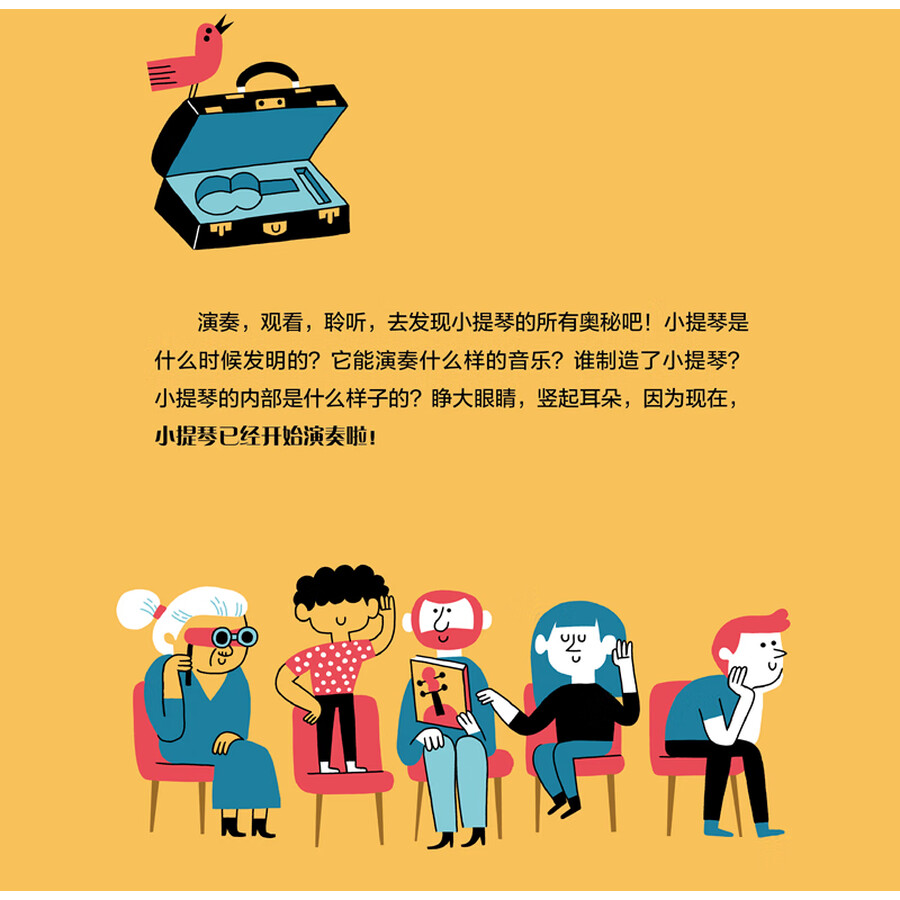这是一套集视、听、看、动手于一体的音乐启蒙发声书,专为对音乐感兴趣并正在考虑乐器学习的儿童打造,也适用于其他年龄段对音乐有兴趣的音乐爱好者。通过书中专业、严谨的文字,有趣的插图,绘声绘色的趣闻轶事,以及页面上的各种机关——“窗口”、拉页、发声环节,儿童能更全面地了解并认识乐器,还能透过乐器了解与其相关的历史、音乐家和音乐作品,最终与音乐结下不解之缘。