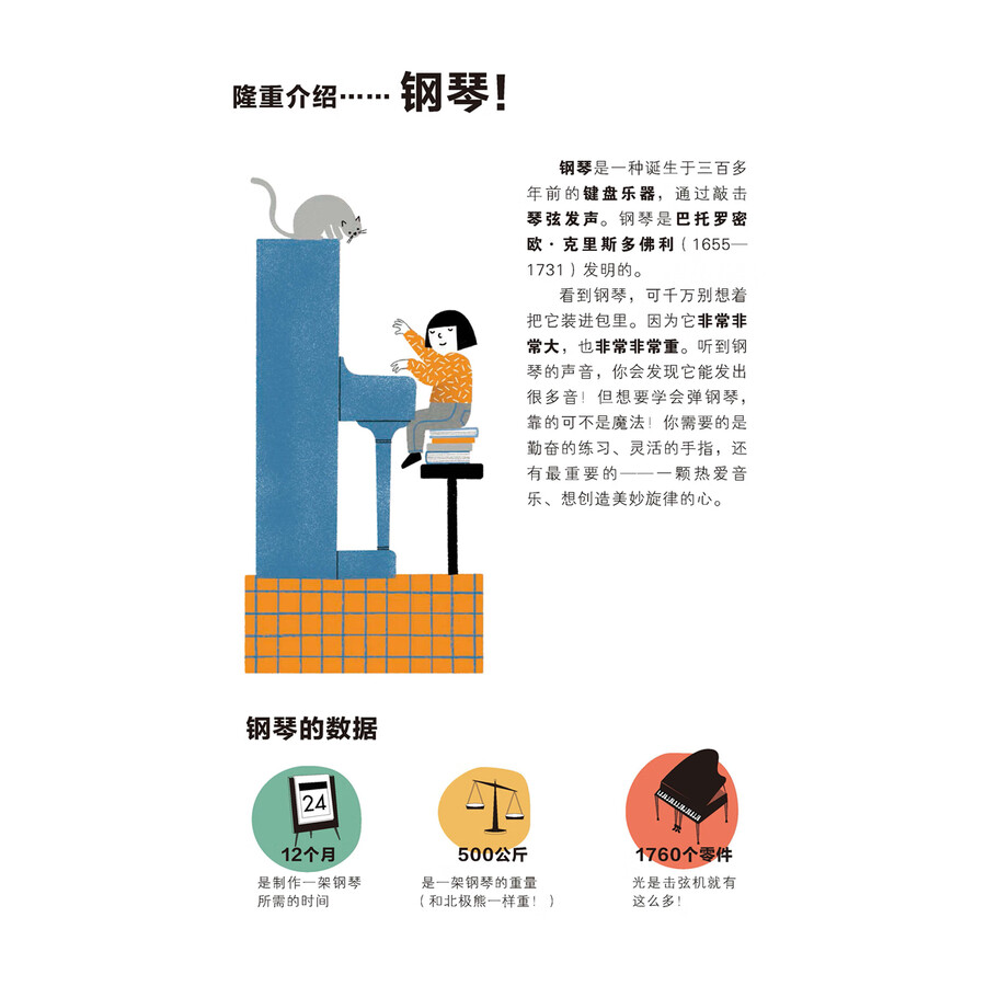 这是一套集视、听、看、动手于一体的音乐启蒙发声书,专为对音乐感兴趣并正在考虑乐器学习的儿童打造,也适用于其他年龄段对音乐有兴趣的音乐爱好者。通过书中专业、严谨的文字,有趣的插图,绘声绘色的趣闻轶事,以及页面上的各种机关——“窗口”、拉页、发声环节,儿童能更全面地了解并认识乐器,还能透过乐器了解与其相关的历史、音乐家和音乐作品,最终与音乐结下不解之缘。