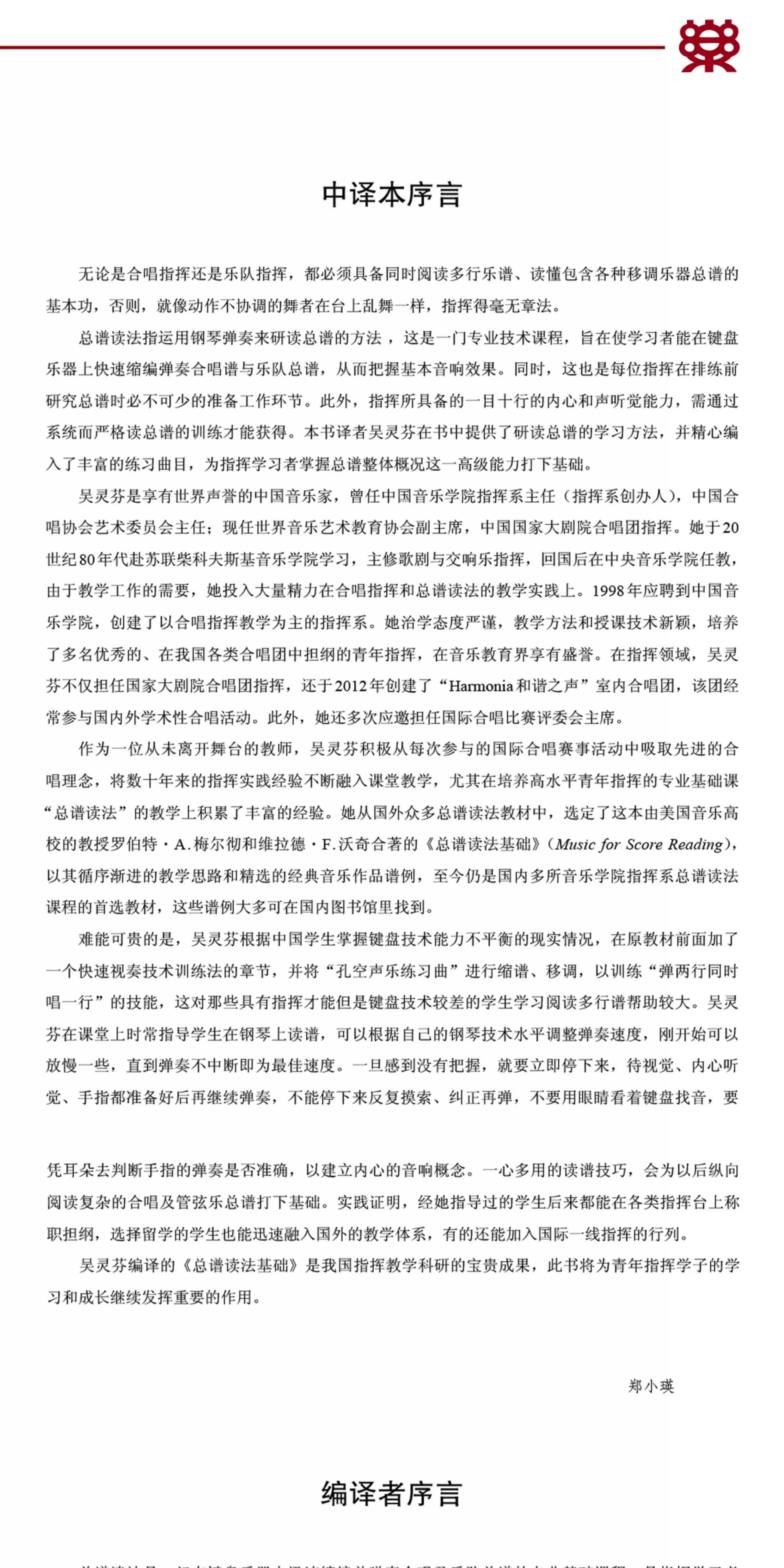 罗伯特. A. 梅尔彻,美国音乐教育家,专注于指挥教学与总谱读法研究。他与W. F. Warch合著的《总谱读法基础》被多国音乐学院采用,成为指挥学习的经典教材。该书以系统性和实用性著称,尤其适合非欧美音乐传统的学习者。维拉德. F. 沃奇,美国音乐理论及指挥学教授,研究方向包括总谱分析、指挥技法等。他与R. A. Melcher合著的教材以清晰的逻辑和丰富的谱例闻名,为指挥训练提供了高效的学习体系。吴灵芬,中国音乐学院指挥系(前系主任)教授, 中国合唱协会艺术委员会主任;世界音乐与艺术教育协会副主席;中国教育部艺术教育委员会专家团成员;中国国家大剧院合唱团指挥。吴灵芬教授毕业於中央音乐学院指挥系,先后在北京河北梆子剧院,北京歌舞团交响乐团担任指挥工作,后调入中央音乐学院指挥系。
