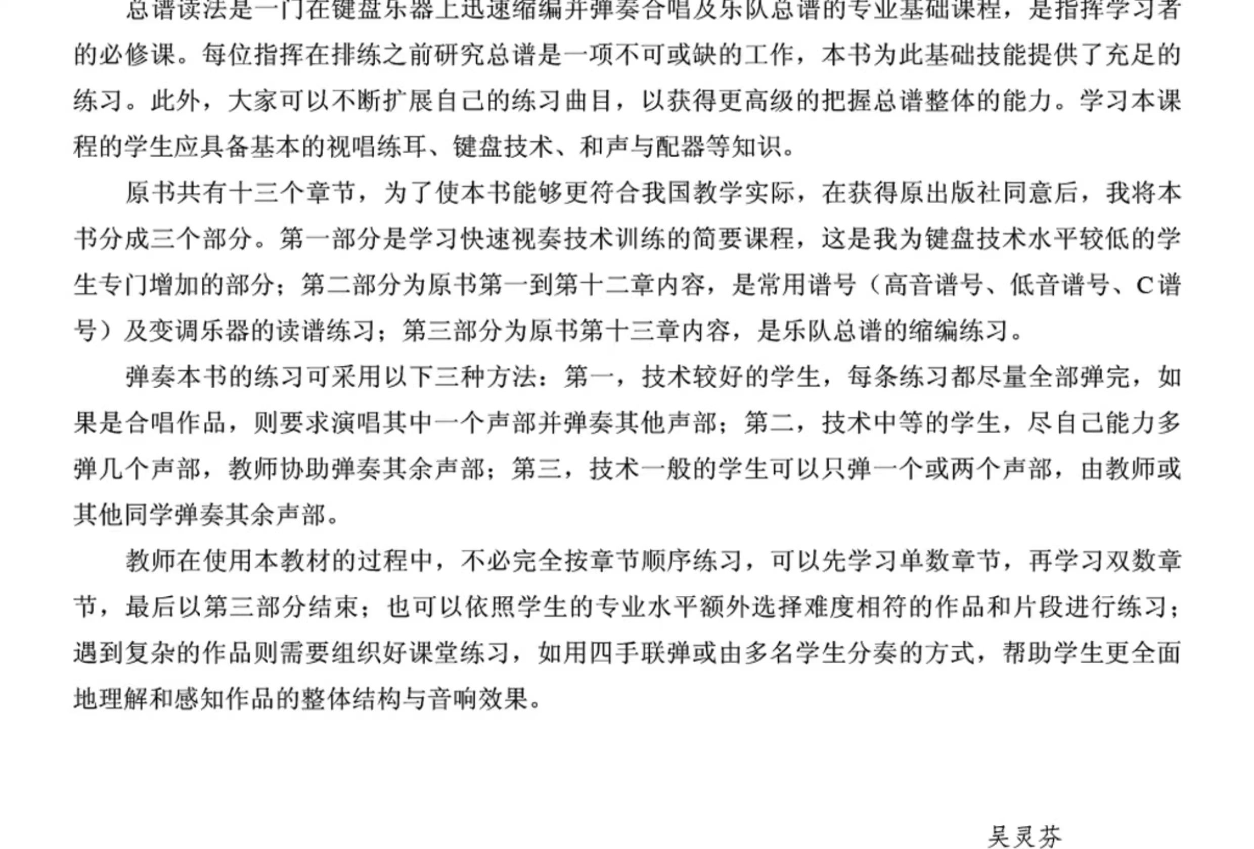 本书是由我国著名指挥家、教育家吴灵芬教授翻译并编写的美国指挥课程教材,以美国罗伯特•A. 梅尔彻和维拉德•F.沃奇教授合著的《总谱读法基础》为蓝本,结合中国指挥教学实际需求精心编撰而成。作为指挥专业核心课程教材,本书系统讲解了总谱读法的基本原理与实践技巧。其最大的特色在于:谱例精选自我国图书馆常见的经典音乐作品,教学体系循序渐进、易于掌握,具有极强的实用性和可操作性。吴灵芬将自己数十年的指挥实践经验和国际先进教学理念融入教材编写,使这本经典教程更加贴合中国音乐教育实际。该书自引入以来,已成为我国音乐学院指挥系“总谱读法”课程的基础教材,由著名指挥家郑小瑛作序推荐,是培养高水平青年指挥人才的必备专业用书,能对我国指挥专业教学的发展产生深远影响。