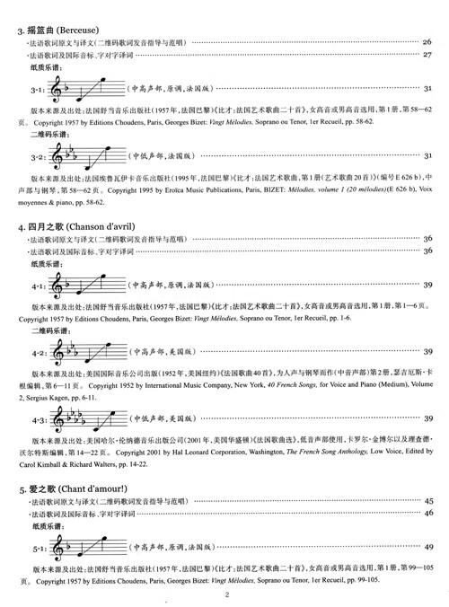 (1)以往选编的法国艺术歌曲大多只有适合高声部的一个调。为了教与学的便利,编者把每一首不同调的法国原版乐曲按照从高至低排列,便于高、中、低声部及不同程度的学生根据自己的实际情况灵活选用。每一首歌曲的开始之处,均标有音域图示,注明了每首歌曲的低音和高音。