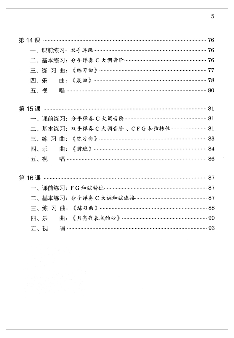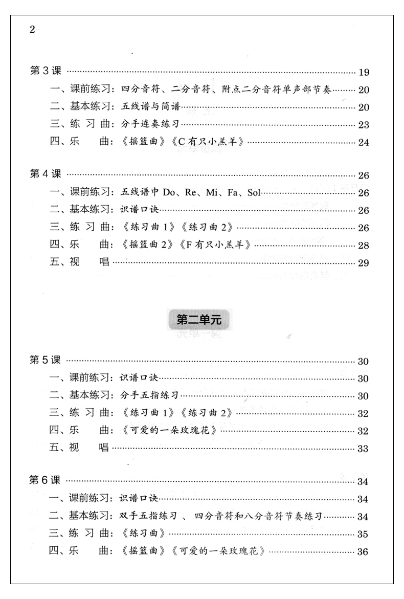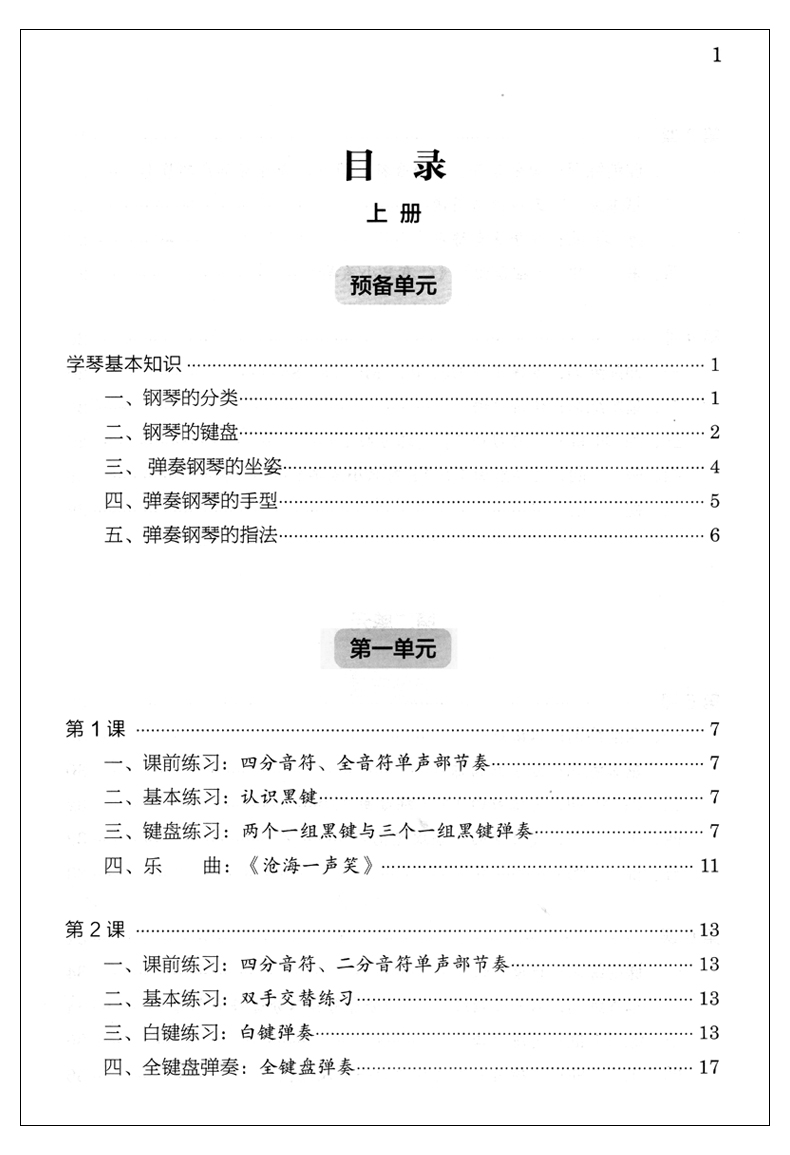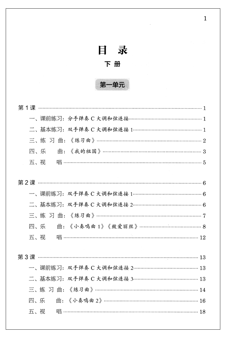 本教材的一大创新之处在于其科学的课程量化体系。全书共32课,分为上下两个学期,每学期16课时,每节课时长为90分钟,确保您在一年内能够系统、全面地掌握钢琴演奏的基本技能。每节课的内容都经过精心编排,包括基础理论知识、课前练习、弹奏练习、弹唱练习以及身体统合练习等,旨在让您在理论与实践的完美结合中,享受学习的乐趣,提升演奏的水平。