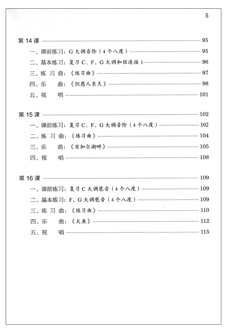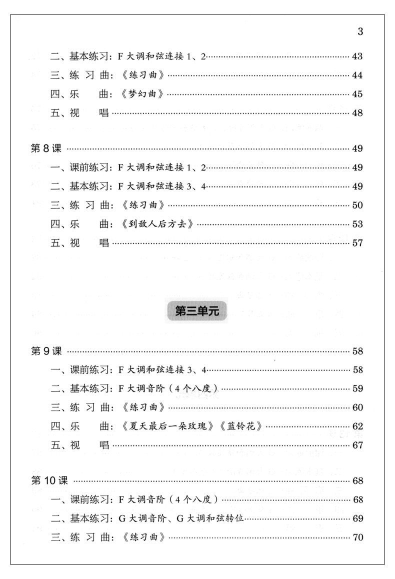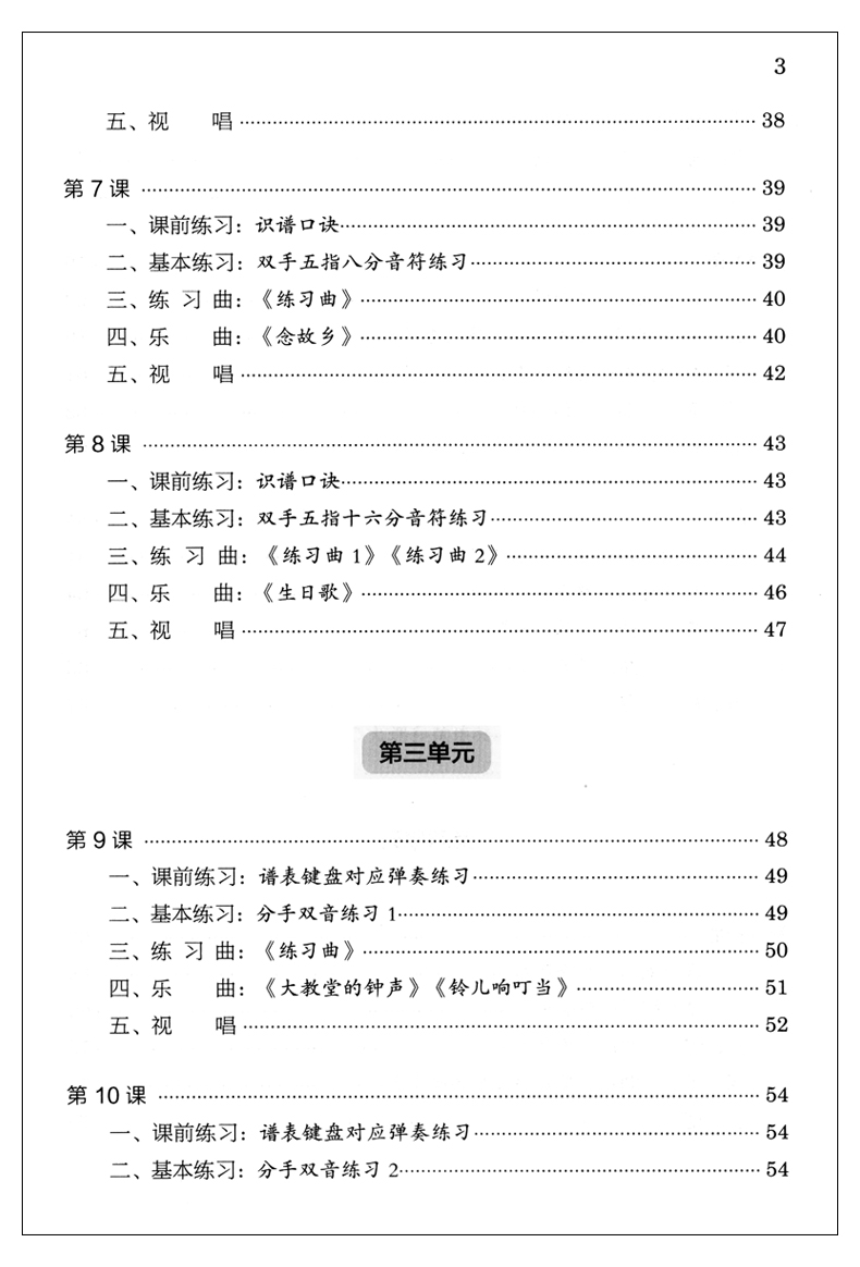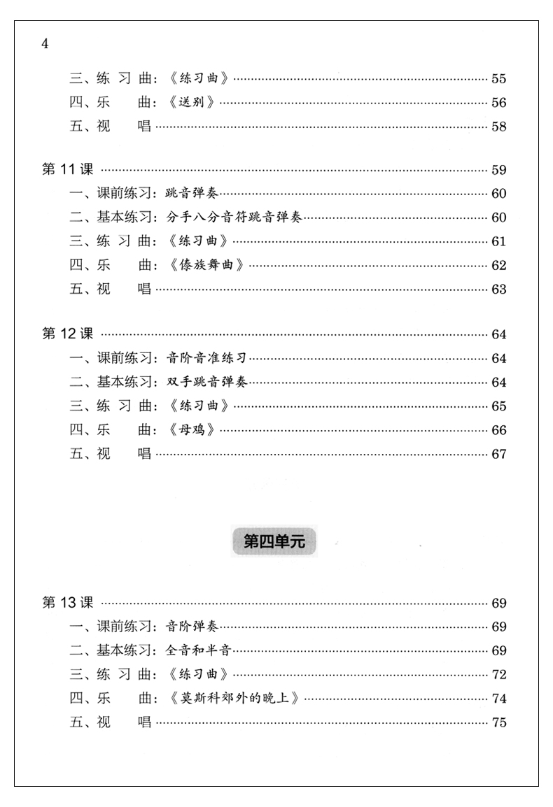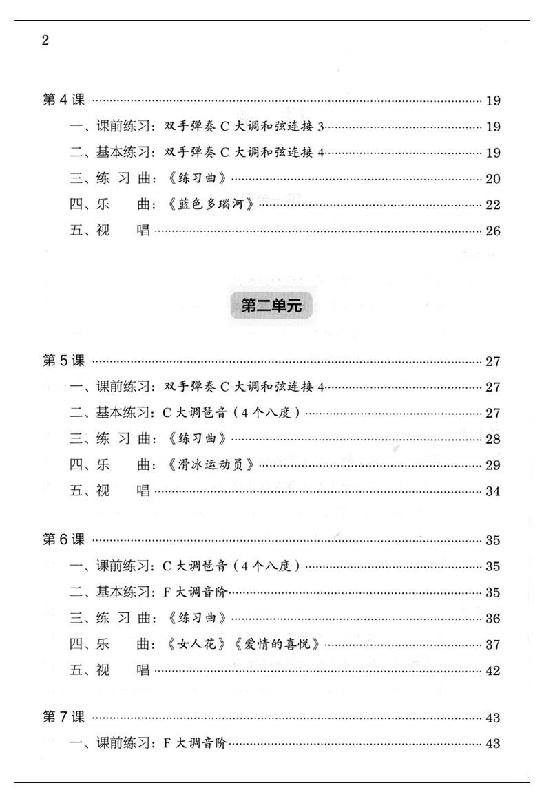 本教材的一大创新之处在于其科学的课程量化体系。全书共32课,分为上下两个学期,每学期16课时,每节课时长为90分钟,确保您在一年内能够系统、全面地掌握钢琴演奏的基本技能。每节课的内容都经过精心编排,包括基础理论知识、课前练习、弹奏练习、弹唱练习以及身体统合练习等,旨在让您在理论与实践的完美结合中,享受学习的乐趣,提升演奏的水平。