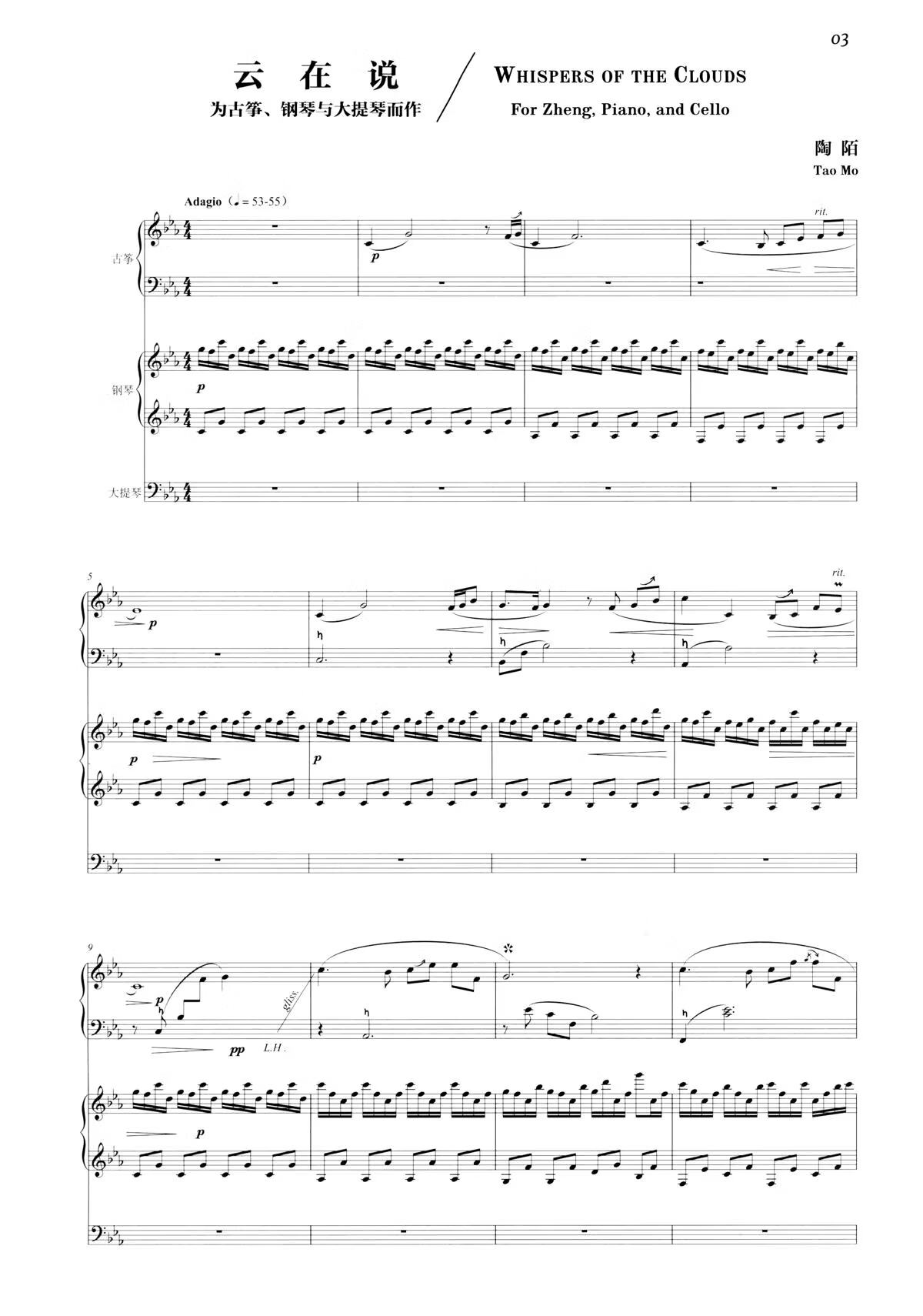 乐曲以“云”为引,以“说”为怀,在多层次的音色铺陈与流动结构之中,呈现点与线的交融,歌与叙的汇聚。作品借助中国写意的思维方式,将线条的描绘、音色的晕染、节奏的点抒融合一体,描绘出云水相连、心性同音的气韵与神往。作品立足于中国弹拨乐的表现特质,同时结合多种音响语汇的色彩差异,展现线性写意与抒情铺陈相互交织、彼此映衬的音乐意境。