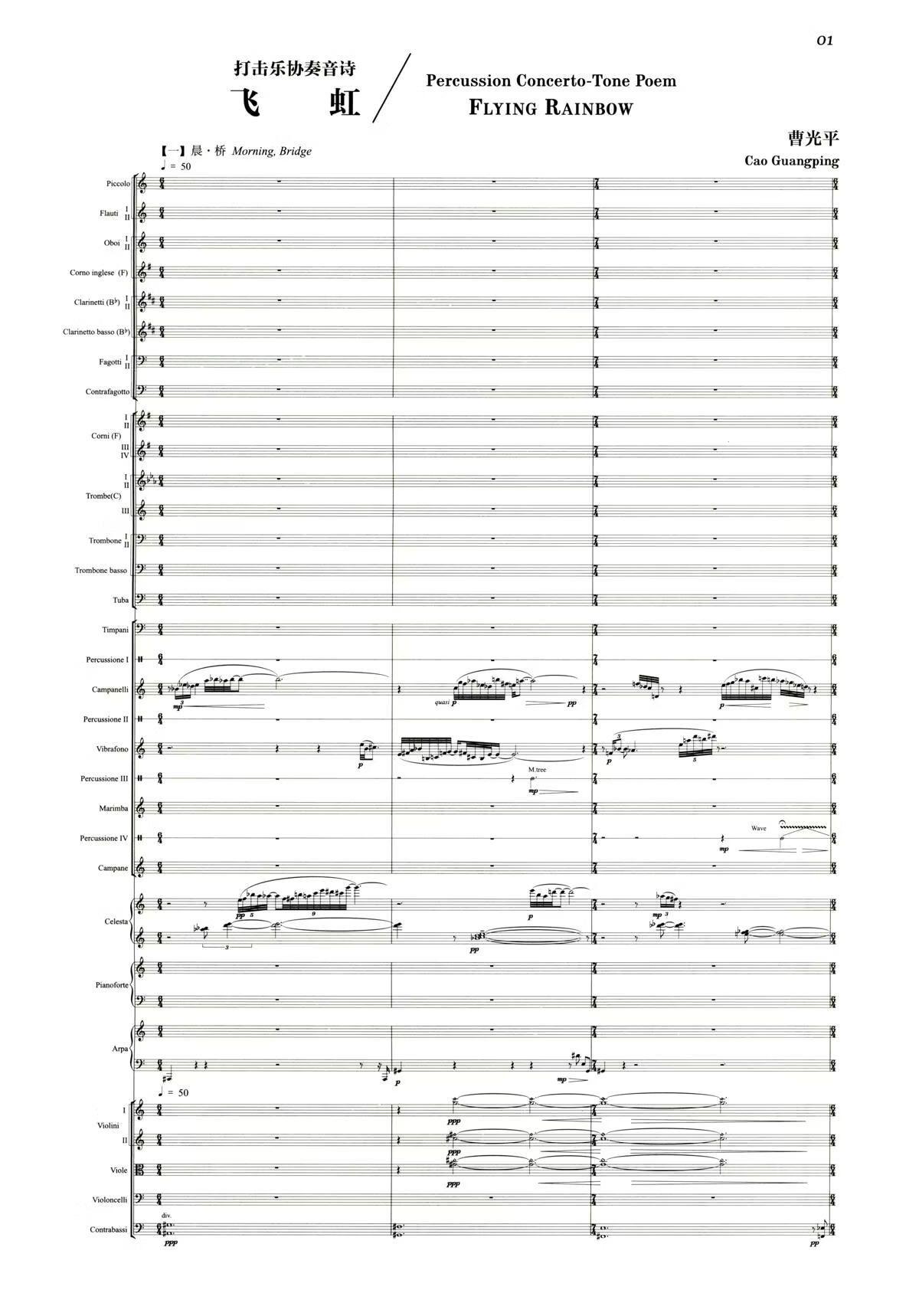 打击乐协奏音诗《飞虹》的创作源于曹光平教授2019年去珠海实地参观伟大的港珠澳大桥工程的经历。港珠澳大桥工程于2009年开工,2018年通车,用短短九年,创造了世界奇观般的超长跨海大桥,堪称伟大壮举。曹教授当时心情十分激动,回广州后便写作了这部管弦乐作品。作品通过抒情优美的旋律、现代华丽的和声语言,以及打击乐丰富多变的节奏与音色,表现和歌颂伟大的港珠澳大桥,赞美祖国南方粤港澳大湾区的壮美。作品的音乐素材全部源自粤港澳大湾区人民最喜爱的粤剧、粤曲,包括《帝女花》主题和粤曲“乙凡调”等。《飞虹》入选国务院文化和旅游部2020-2021年度“时代交响——中国交响音乐作品创作扶持计划”。