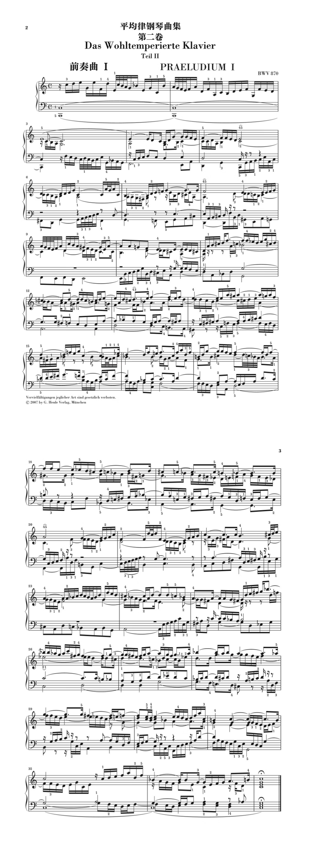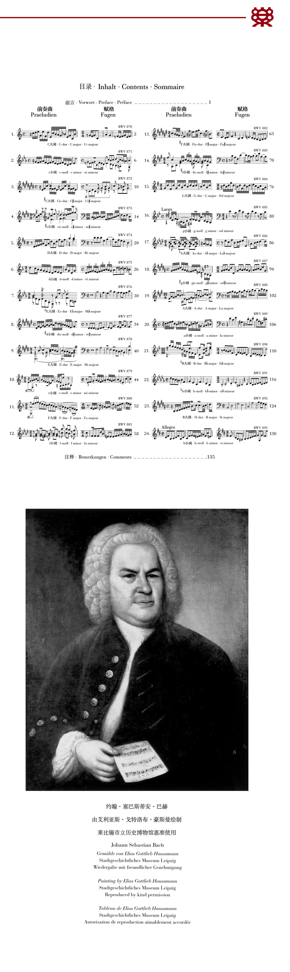 德国亨乐音乐出版社的出版物包括重要的古典钢琴曲目、室内乐及各种体裁的乐器作品。其乐谱有两大特色:一、推崇“原作版”,在版本编辑上倾注了大量严谨的编辑加工,力求澄清原作在几百年流传过程中的讹传。二、在乐谱制作方面,从版面设计到纸张选择,均以最舒适的视觉和手感为宗旨。 此次引自的巴赫系列出版物共5本,分别为:《六首帕蒂塔》《平均律钢琴曲集 第一卷》《平均律钢琴曲集 第二卷》《法国组曲》和《赋格的艺术》。 《平均律钢琴曲集》分为上下两册,共48首,每一首都包括一个前奏曲和一个赋格曲。上册完成于1722年,下册完成于1744年,前后历时20余年,这段时期是巴赫一生中创作的旺盛期,曲集的最终完成是巴赫的思想和他对复调音乐探索的总结,是一部无与伦比的巨作。